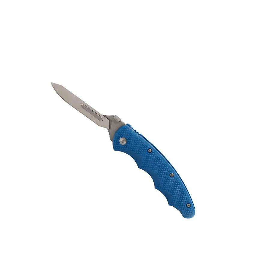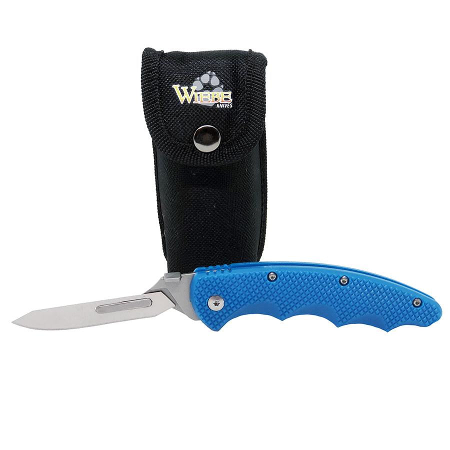 The Arctic Fox is a replaceable blade hunting knife that sports an all-new, steel blue polymer handle with ergonomic finger grooves for comfort during long cutting jobs. This custom skinning knife also features cross-cut texturing throughout the entire handle for non-slip use, making it the best skinning knife around.